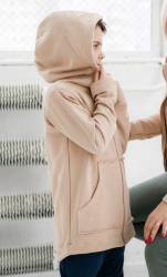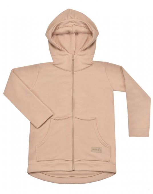 Pod zadok predĺžený mikinokabátik s kapucňou od obľúbenej značky Tuss. V prednej časti sa nachádzajú dve vrecká a zapína sa klasicky na zips. Je pohodlný, vyrobený z príjemného materiálu. Nieje podšitý, je tenší ako klasická mikina, nieje preto vhodný do príliš chladného počasia.